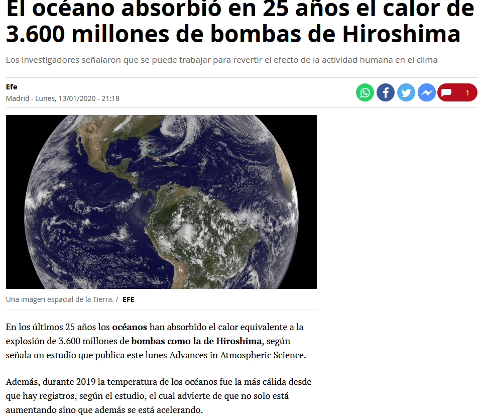La segunda noticia, a dos columnas en la parte superior derecha de la página y con foto, corresponde al artículo sobre el calentamiento de los océano. Esta información plantea, por un lado, datos sobre la crisis climática, un tema de máximo interés informativo, y presenta un titular llamativo para atraer la atención del lector.