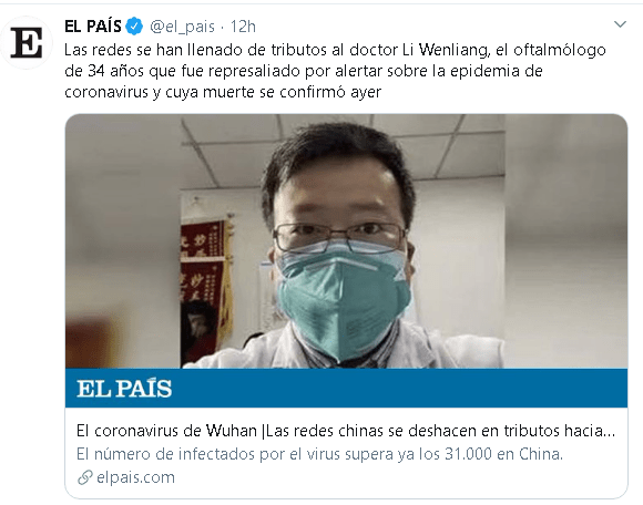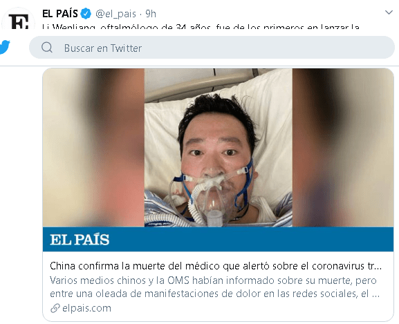 Para encontrar el primer twuit sobre el medico chino fallecido hay que retroceder 9 horas: