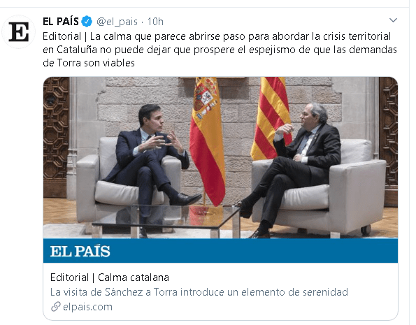 En cuanto a la reunión Sánchez-Torra, sobre las 9 de la mañana se tuiteaba el editorial del diario: